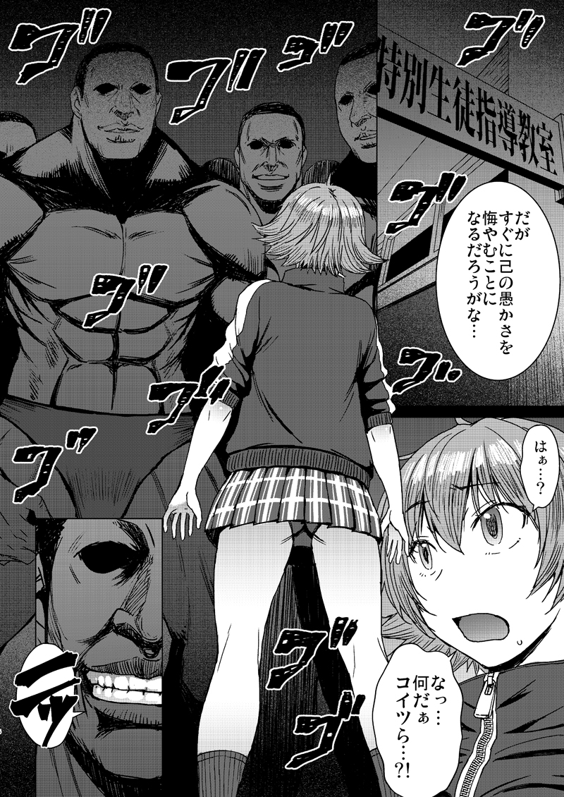 そしてある日、またジャージで歩いているのを軍畑に咎められたのを逆に挑発し軍畑の怒りを買い、半ば自ら特別生徒指導教室、またの名を「黒人交尾部屋」へと放り込まれてしまうのでした。