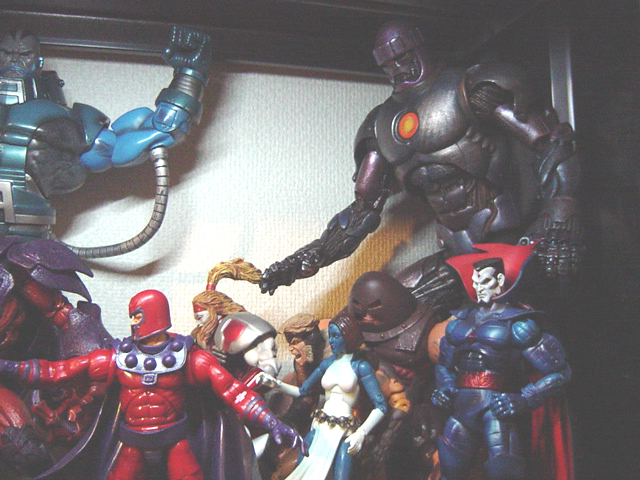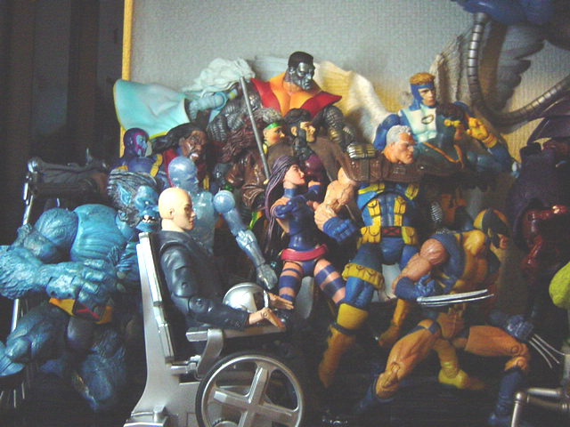 その下の段の左からアークエンジェル、ビショップ、ローグ、ガンビット、サイクロプス、手前左からビースト、エクゼビア教授、アイスマン、サイロック、ウルヴァリン。